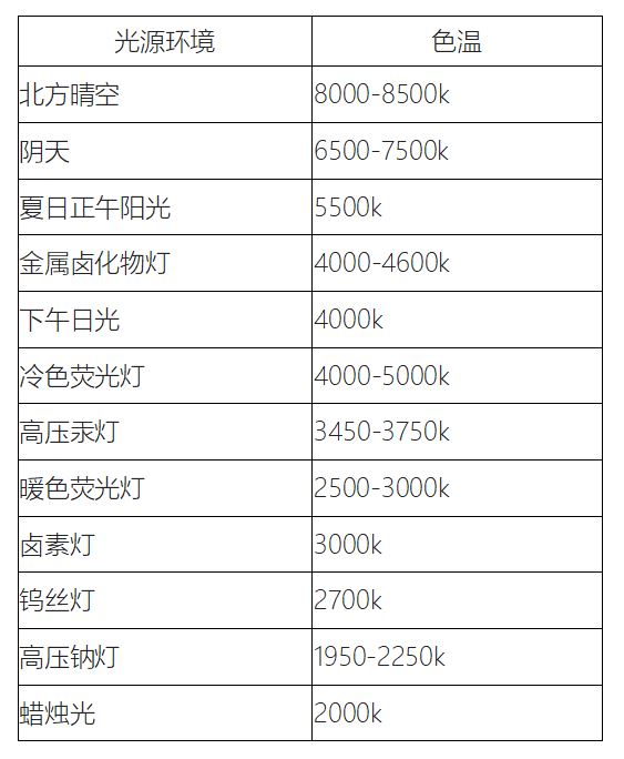 3. 不同光源環(huán)境的相關(guān)色溫度光源色溫參數(shù)表